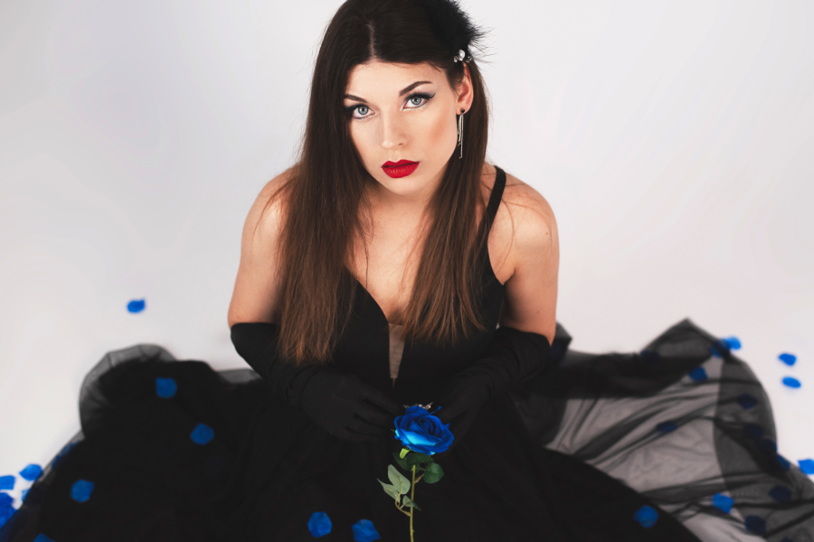 CZERŃ (żałoba) – postać w czerni, odrywająca płatki niebieskiej róży: symbol pożegnania z przeszłością i rytualnego domknięcia rozdziału.